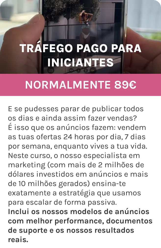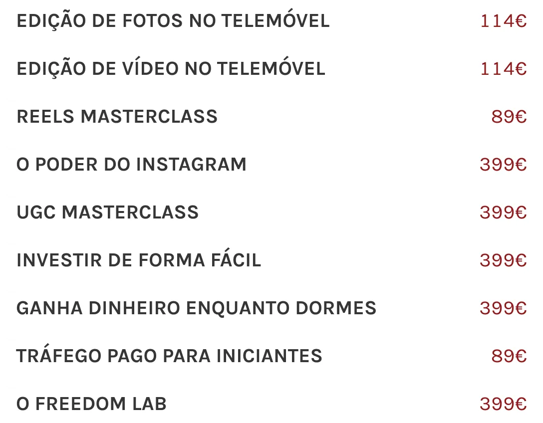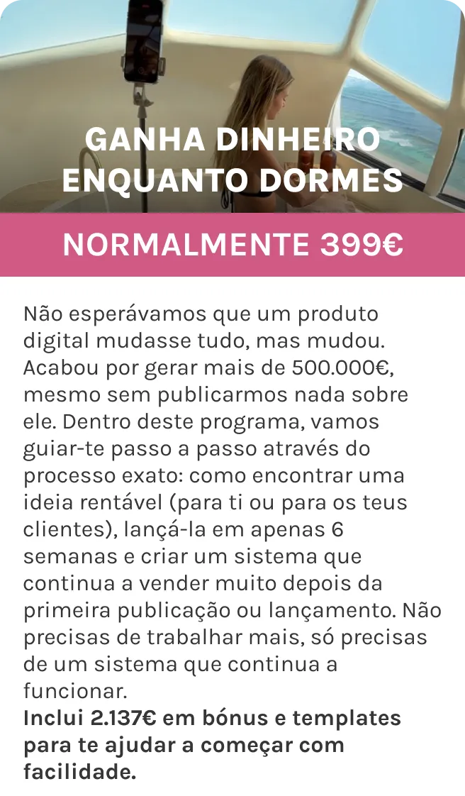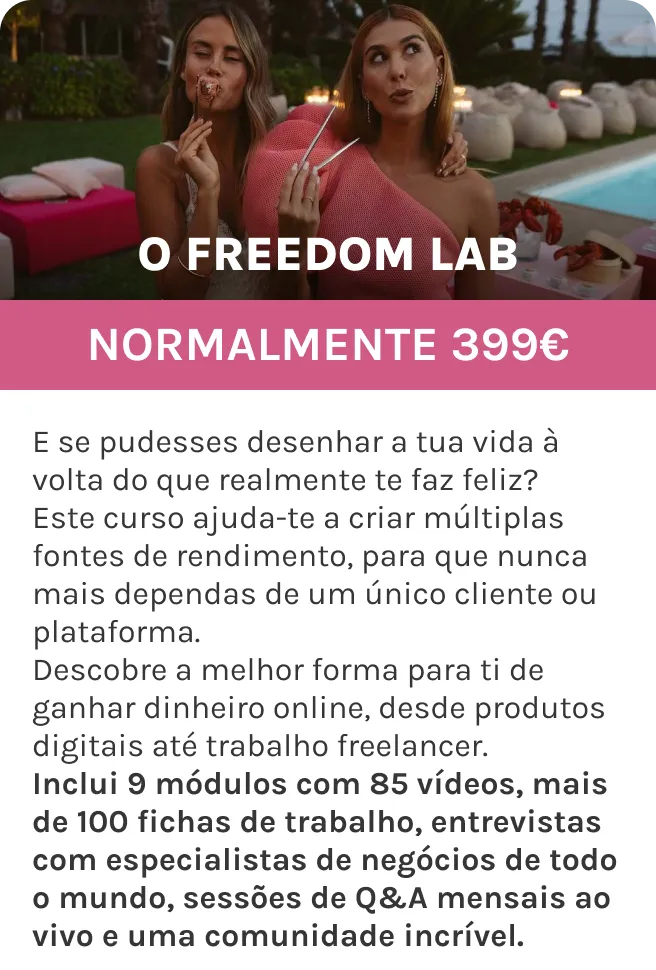 Cada curso. Cada estratégia. Constrói rendimento a partir do teu conteúdo, lança cursos rentáveis, investe como uma profissional e cria múltiplas fontes de rendimento que te pagam para sempre. 9 cursos completos que te ensinam a ganhar dinheiro, gerir dinheiro e fazer o teu dinheiro crescer!